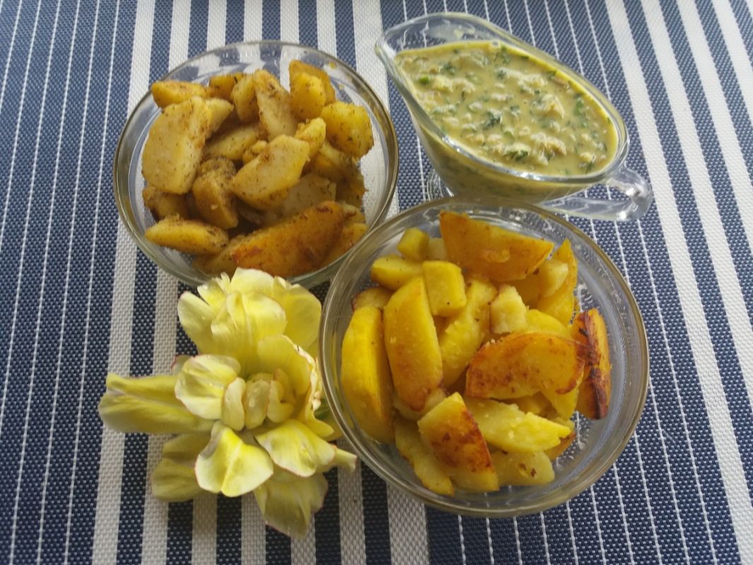 После этого картофель очищают и нарезают на крупные дольки. Приготовление происходит в два этапа: сначала жарят с приправами, затем — только с солью. Когда картошка приобретет золотистую корочку, её приправляют и подают вместе с освежающим соусом тартар.