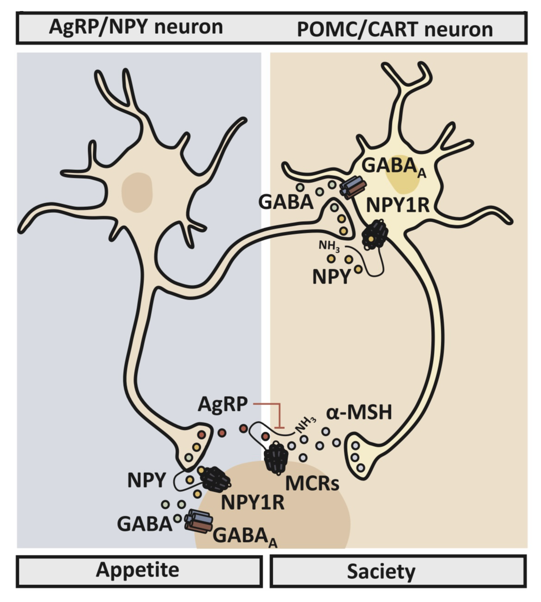 Анорексигенные нейроны, производящие проопиомеланокортин (POMC) и котрансмиттер CART, играют важную роль в подавлении аппетита, связываясь с рецепторами, которые уменьшают его интенсивность. В свою очередь, орексигенные нейроны сигнализируют о голоде, выделяя нейропептид Y (NPY) и агути-подобный пептид (AgRP), что имеет прямое влияние на увеличение потребления пищи.