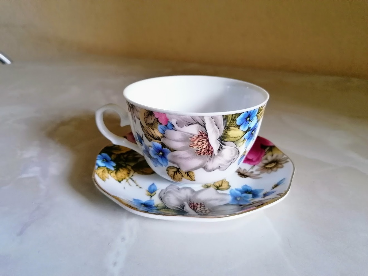 Чайной паре уже около 30 лет. Ранее это был великолепный японский сервиз, украшенный позолотой, но, к сожалению, осталась только эта одна чашка. Разные части сервиза подверглись испытаниям времени, и автор надеется, что любимая чашка уцелеет при предстоящем переезде.