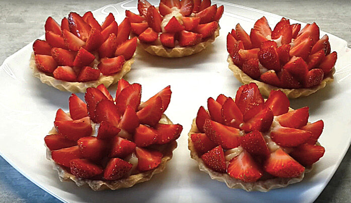 Когда тарталетки готовятся, дайте им остыть, затем извлеките из формочек и наполните творожным кремом на ?. Завершите угощение свежей клубникой — просто промойте, обсушите и, при желании, нарежьте на части.
