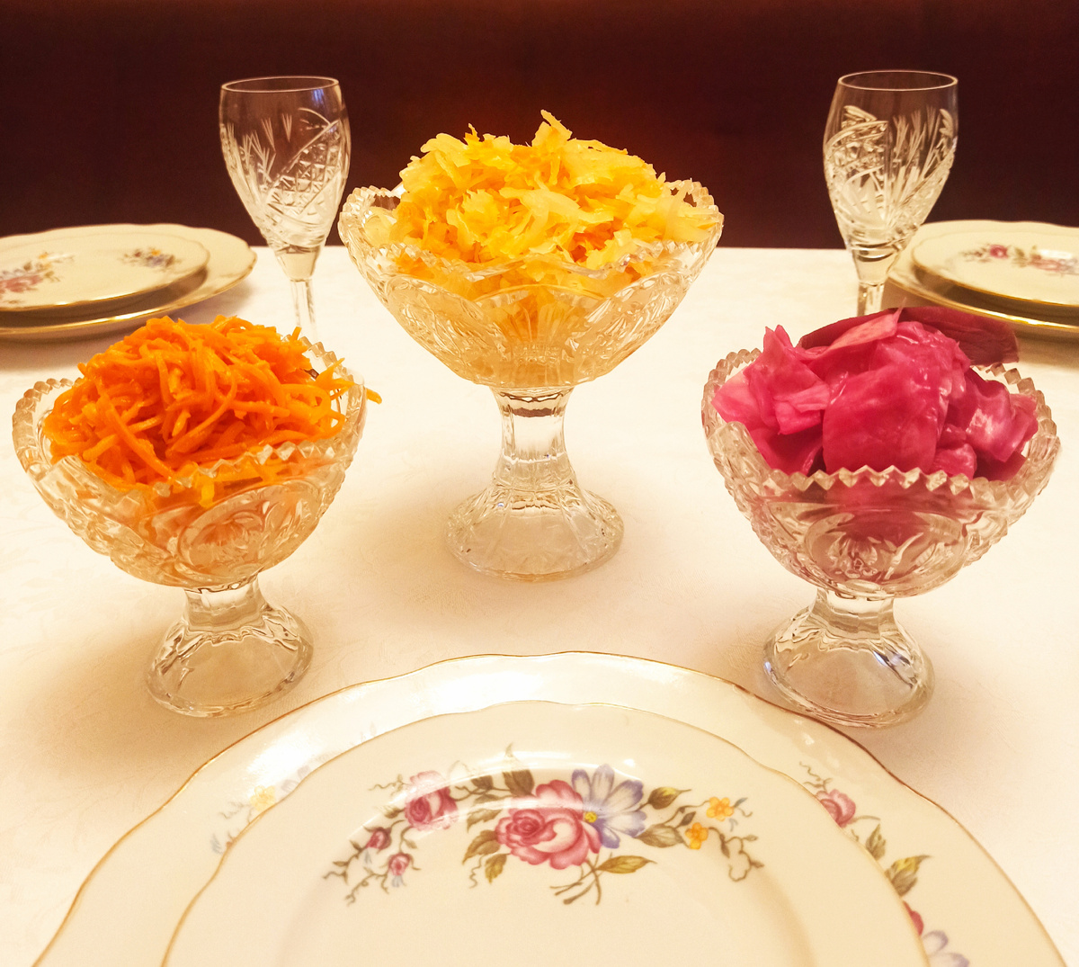 Огромный стол был обилен щедрыми угощениями, в центре внимания которого оказались свежезаготовленные овощи от родственников. Капуста, квашенная с добавлением свеклы, чеснока и сельдерея, была готова к подаче — каждая порция служила настоящим украшением стола.