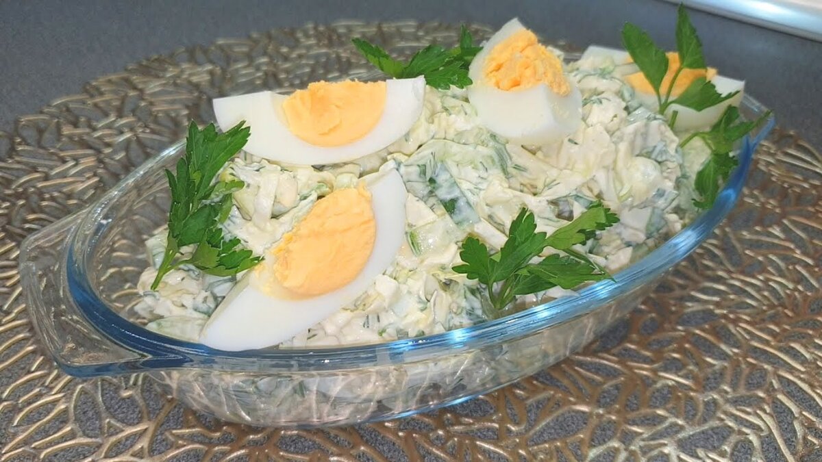 Отварите три яйца: одно из них сохраните для украшения, а два нарежьте и добавьте в основную массу. Затем введите оставшиеся 150 граммов сметаны, перемешайте все ингредиенты и добавьте при необходимости соль. Как финальный штрих, украсить салат можно половинками яйца и свежими веточками петрушки.