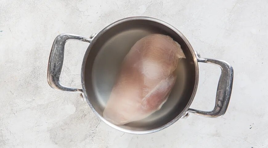 Чтобы начать, возьмите куриную грудку и поместите ее в кастрюлю. Залейте 500 мл горячей воды и доведите до кипения на сильном огне. После этого уменьшите огонь до среднего, снимите образовавшуюся пену, добавьте немного соли и варите мясо в течение 25 минут.