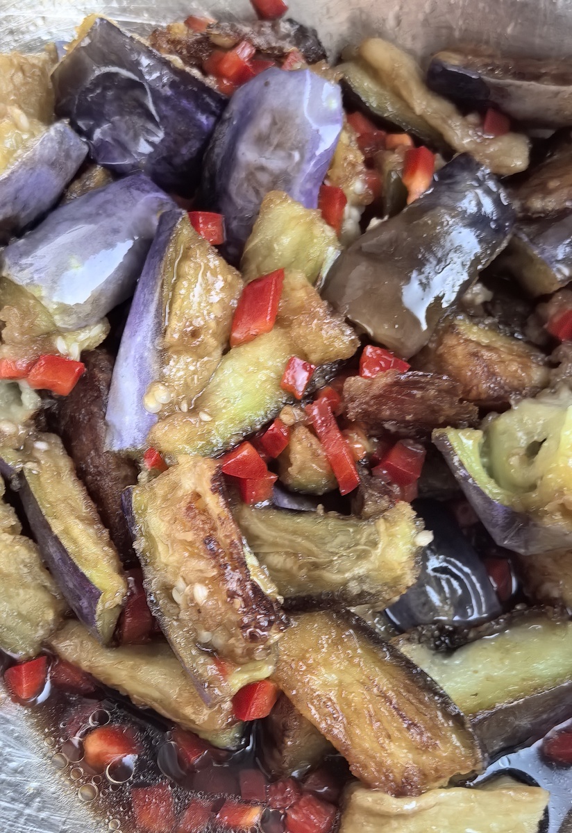 - Залить теплые баклажаны соусом, аккуратно перемешать и подавать немедленно, пока они хрустящие.