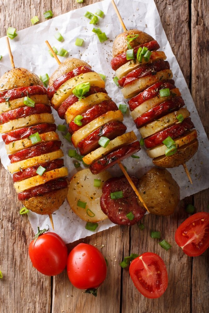 Собрать шпажки. Слегка смажьте шпажки оливковым маслом и начинайте нанизывать кружки картофеля и колбасы поочередно.