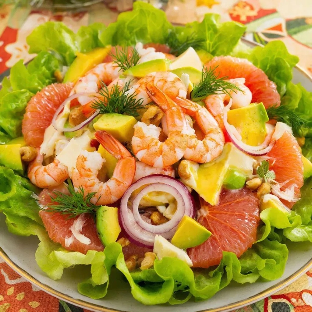 Салат, который не оставит никого равнодушным: он объединяет сладость тигровых креветок, нежность авокадо и яркую кислинку грейпфрута. Подача этого блюда выглядит очень эффектно и станет изюминкой любого праздничного стола.
