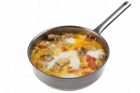 Затем яйца взбиваются с добавлением соли — просто до объединения белков и желтков. Полученной смесью заливается содержимое сковороды, после чего накрывается крышкой и оставляется на небольшом огне на 2-3 минуты.