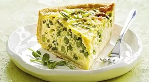 - Ингредиенты: сыр гауда, замороженный зеленый горошек, яйца, сливки, зеленый и репчатый лук, чеснок и специи.