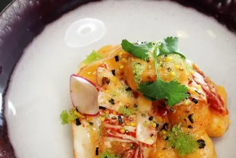 Смешайте готовые креветки с соусом и добавьте аккуратно нарезанную капусту кимчи. Подавайте на тарелках, украсив свежими листьями кинзы, тонкими кружками редиса и икрой тобико. Не забудьте посыпать фурикакэ — это придаст вашему блюду дополнительный аромат и текстуру. Блюдо готово, пора наслаждаться!