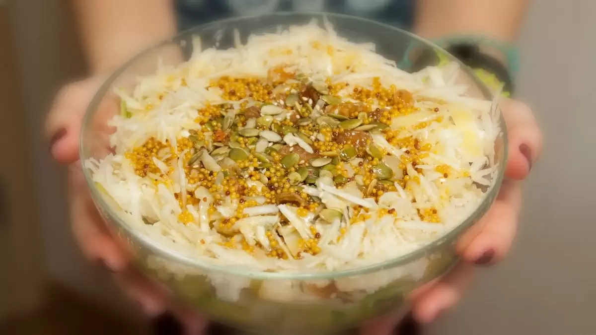 Не забываются и семена – кунжут, лен и тыква хорошо дополнят основную массу. Изюм промывается горячей водой, сушится и добавляется в салат.