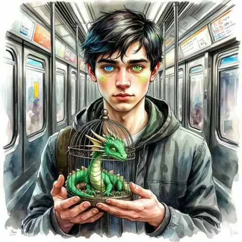 Но вот на горизонте появляется эксцентричный человек с необычным питомцем. В клетке у него загадочная рептилия с сине-зеленой чешуей, сверкающей позолотой. Эти глазки словно заглядывают в душу, а крылья — как у стрекозы. Неужели это дракон? Поразительное событие, хотя так мало кому это заметно.