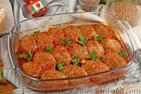 - Гречаники с фаршем — идеальное сочетание гречки и мяса с добавлением свежих овощей. Эти котлеты обретут необычный вкус, если запечь их в томатном соусе.