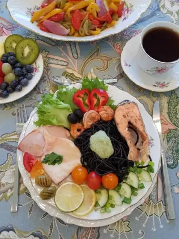 Запеченный перец с луком и спагетти с чернилами каракатицы не только порадуют глаз, но и удивят своим кислым и сладким вкусом. Они станут отличным гарниром к блюдам из рыбы, кальмаров или креветок, добавляя на стол красоту и изысканность. Приятного аппетита!
