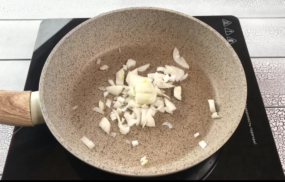 - Начать стоит с подготовки: слегка смазать сковороду маслом, чтобы лук приобрел ароматный оттенок.