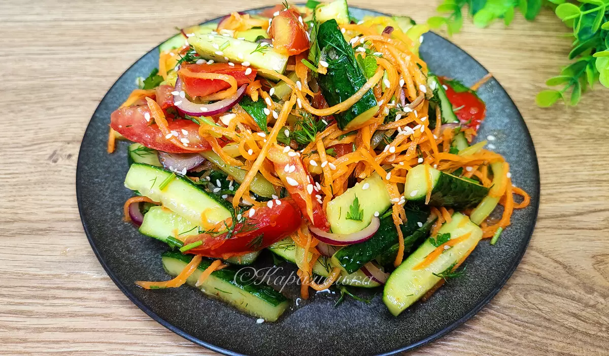 Такой салат — отличный выбор для любого летнего обеда или ужина. В нем сочетается свежесть овощей и лёгкая острота, что делает его идеальным угощением для жарких дней.