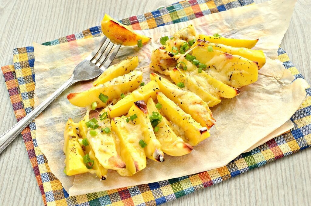 5. Как только картофель будет готов, следует посыпать его натертым сыром и вернуть в духовку буквально на несколько минут, чтобы сыр расплавился и образовал аппетитную корочку.