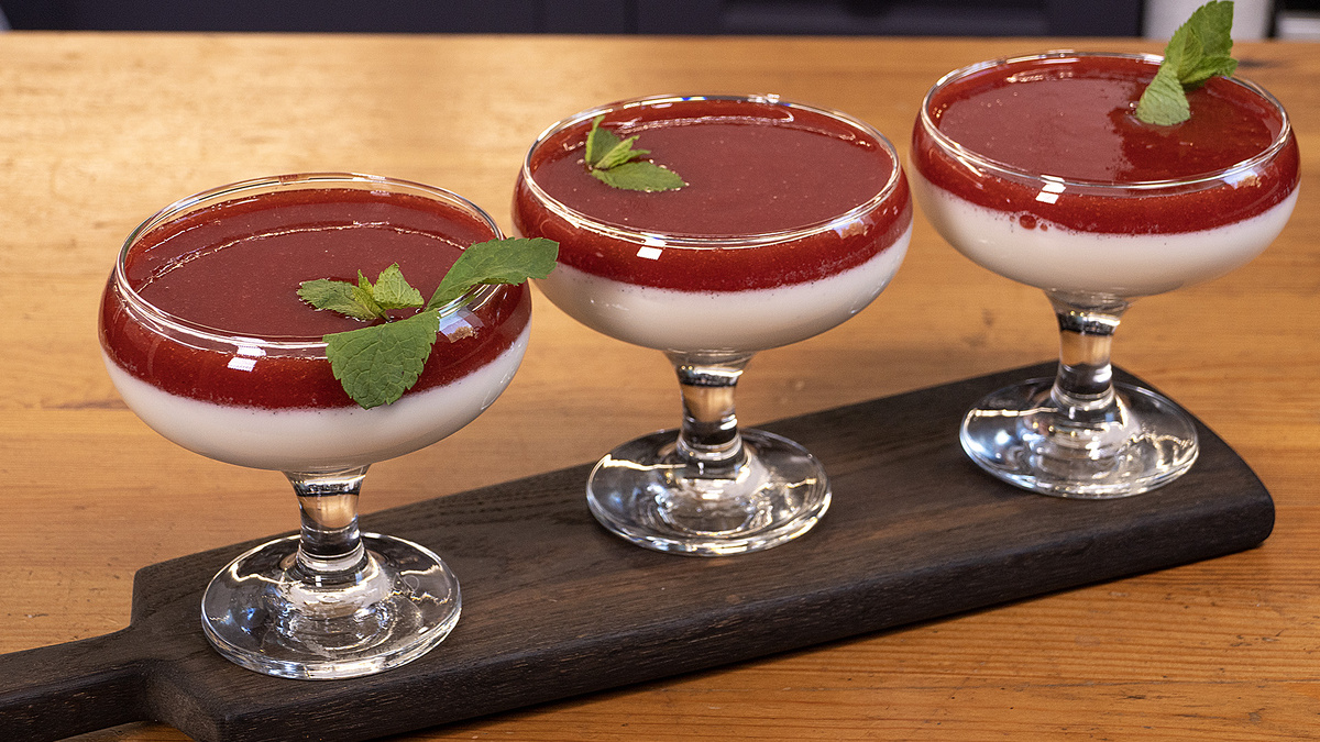 Пока панна-котта охладилась, можно приготовить ягодный соус. Клубнику следует смешать с сахаром и прогреть на небольшом огне, пока сахар не растворится. Затем массу нужно переработать в блендере и процедить через сито. Получившуюся ароматную жидкость аккуратно выливают на застывшую панна-котту и украшают свежими листьями мяты для завершения кулинарного шедевра.