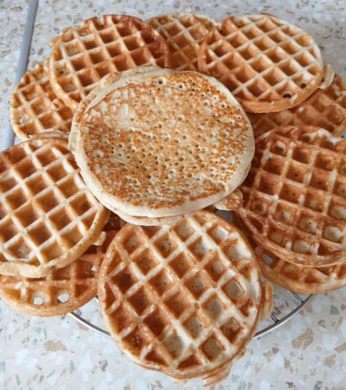 Содержимое на 100 г готовых блинчиков или вафель: 177 ккал, 7,8 г белков, 5,2 г жиров и 21,2 г углеводов. Из них 2,5 г клетчатки, 3,2 г лактозы, 15,5 г крахмала и прочих углеводов.
