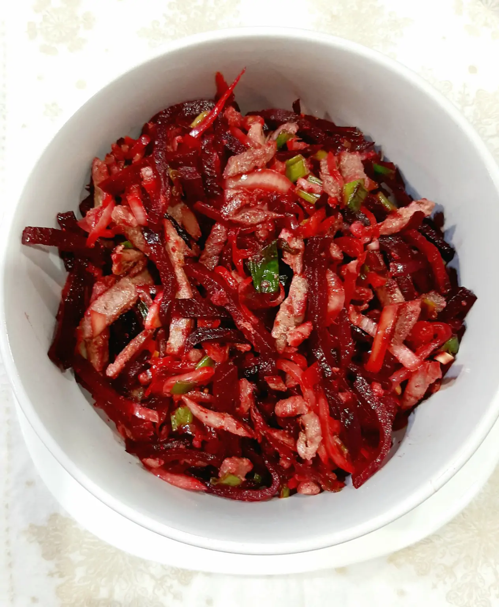 Салат из отварной свеклы с пекинской капустой, репчатым луком и корейской морковью - это абсолютный хит. Такой салат не только вкусный, но и легкий в приготовлении. Заправьте его растительным маслом, и он станет идеальным дополнением к любому обеду.
