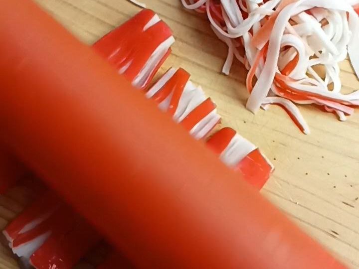- Раскатка крабовых палочек: Используя скалку, крабовые палочки превращаются в красивую текстуру. Просто раскатайте одну упаковку (200 г) на рабочей поверхности.
