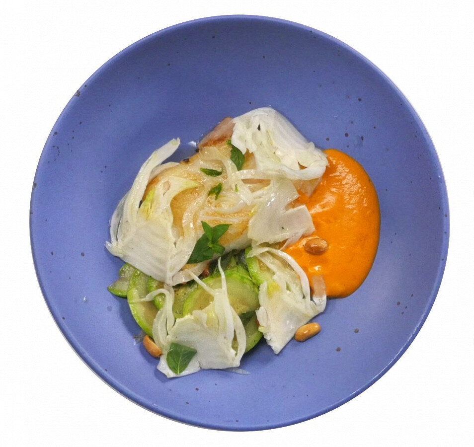 Перец сбрызнуть маслом для жарки и запекать в духовке при температуре 200°C в течение 25 минут.Нарежьте кабачки тонкими кругами, мелко порежьте чили и лук-шалот. Фенхель нарежьте и положите в холодную воду.После запекания заверните перцы в фольгу на 5–10 минут, затем очистите от кожуры и поместите в блендер вместе с горчицей, вам васаби, чили, рисовым уксусом, перцем, сахаром и солью. Измельчите до однородной массы, добавляя заправку с базиликом.Филе палтуса обсушите, посолите и обжарьте на масле в течение нескольких минут с каждой стороны.Фенхель обсушите и маринуйте в смеси из рисового уксуса, сахара, соли и кайенского перца.На сковороде обжарьте кабачки с чили и шалотом, добавьте заправку с базиликом и свежий базилик, перемешайте и снимите с огня. В конце добавьте арахис.На тарелку выложите жареные кабачки, рядом разместите палтус, добавьте соус и маринованный фенхель.Этот оригинальный рецепт станет отличным вариантом для ужина, сочетая легкость, свежесть и великолепный вкус!