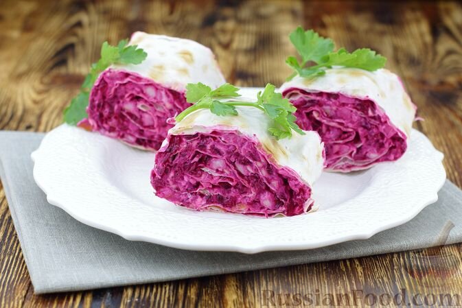 Приготовление предельно простое: свёклу нарезать и смешать с нарезанной курицей и сыром, добавить специи и заправку. Завернуть начинку в лаваш, нарезать на порции и украсить зеленью. Эту закуску не стыдно поднести даже на праздничный стол!