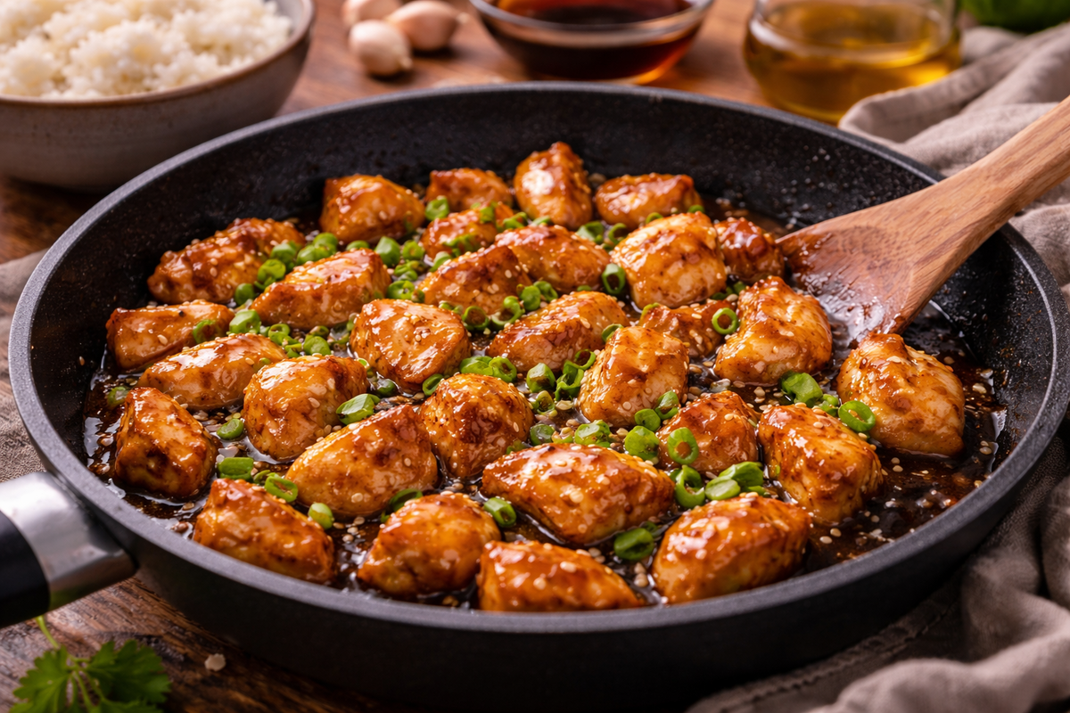 Нарежьте курицу на кусочки и обжарьте на сильном огне до золотистой корочки. Затем добавьте немного чеснока, 3-4 столовые ложки соевого соуса и одну чайную ложку меда. Готовьте пару минут, пока соус не загустеет и не приобретет блестящий вид.