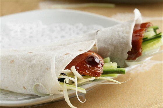 Во время трапезы кусочки запеченной утки заворачиваются в лепешки, смазанные соусом хойсин, и с добавлением лука и огурца создают незабываемый вкус.