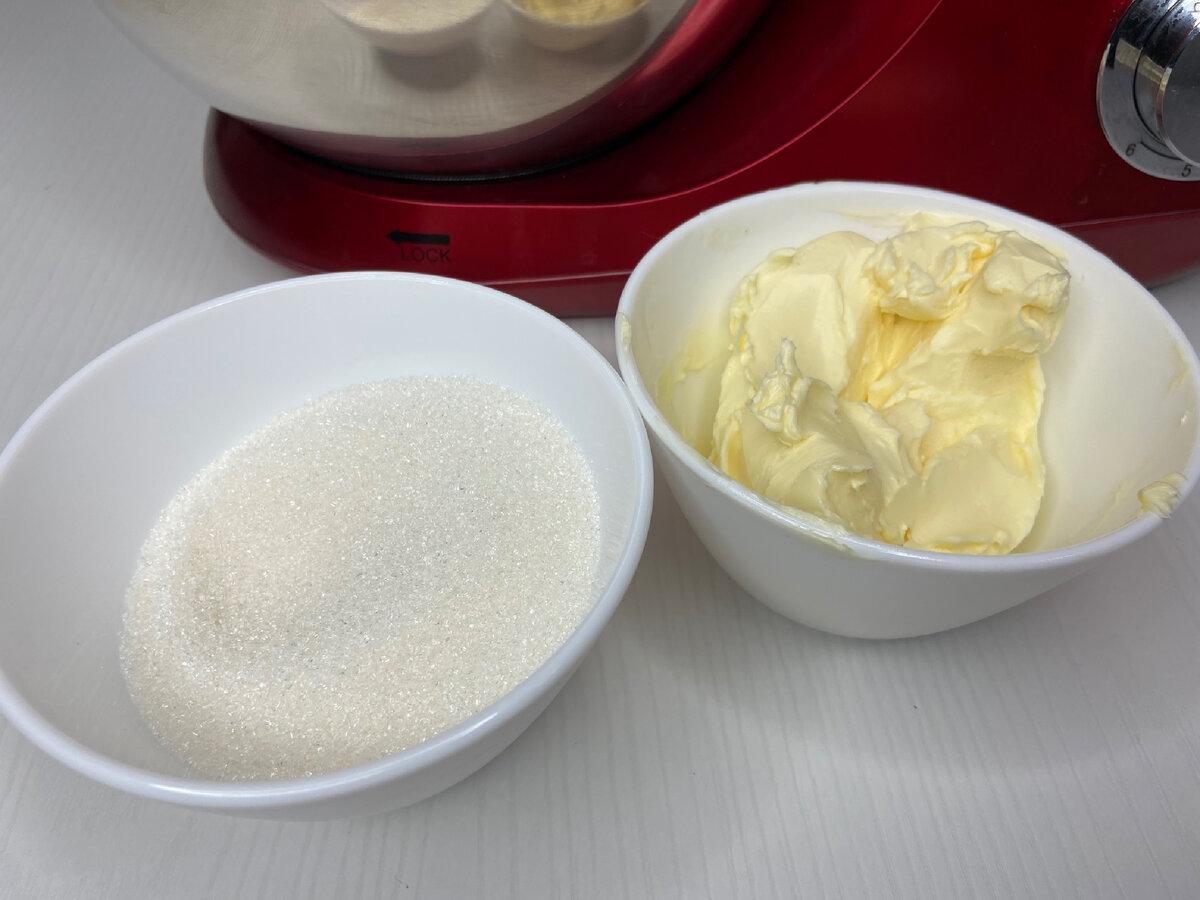 1. В глубокой миске соедините мягкое масло и сахар, тщательно взбейте массу миксером в течение 6 минут.