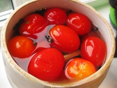 1. Промытые и упругие помидоры укладываются в подготовленную посуду, чередуясь с листьями смородины.