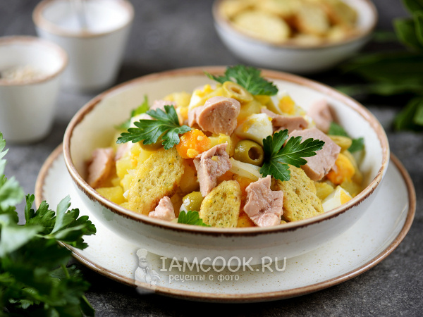 - Салат с печенью трески и сухариками – Ингредиенты: печень трески 115 г, лук 20 г, картофель 2 шт., яйцо 2 шт., сухарики 30 г, оливки 70 г, растительное масло 1 ст. ложка, соль и перец по вкусу, петрушка для оформления. Калорийность: 236 кКал, время приготовления: 30 минут.