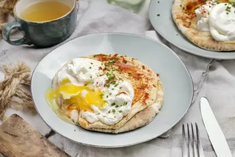 Шаг 2: Разогрейте сковороду и прогрейте питу по 1 минуте с каждой стороны. В отдельной миске смешайте хумус с половиной паприки, кориандром и добавьте немного соли по вкусу. На питу нанесите хумус, посыпьте оставшейся паприкой и полейте оливковым маслом. В завершение аккуратно выложите яйца-пашот сверху. Мелко нарезанный зеленый лук придаст особый акцент вашему блюду.