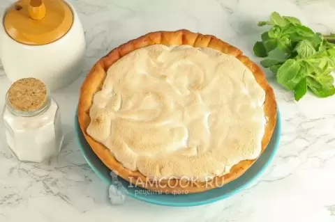 Духовка нагревается до 180 градусов. Пирог ставится на средний уровень и выпекается в течение 25 минут. Пока он готовится, можно заняться меренгой. В сухой миске белки взбиваются с сахаром и щепоткой соли до состояния устойчивых пиков.