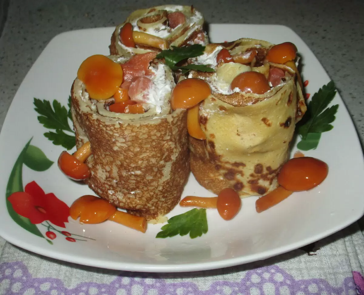 Эти воздушные блины с творожным сыром, форелью и опятами станут настоящим хитом на любом застолье и не оставят равнодушными ни одного гурмана.