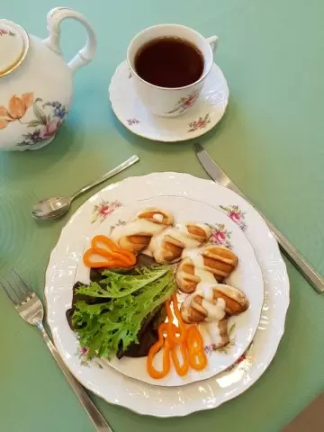 По завершении готовки, красиво выложить шампиньоны на тарелки, предварительно добавив листья свежего салата. Чтобы сделать блюдо еще более аппетитным, полейте его горячим соусом «Субиз» и дополните ломтиками десертного перца для контраста и ярких красок.