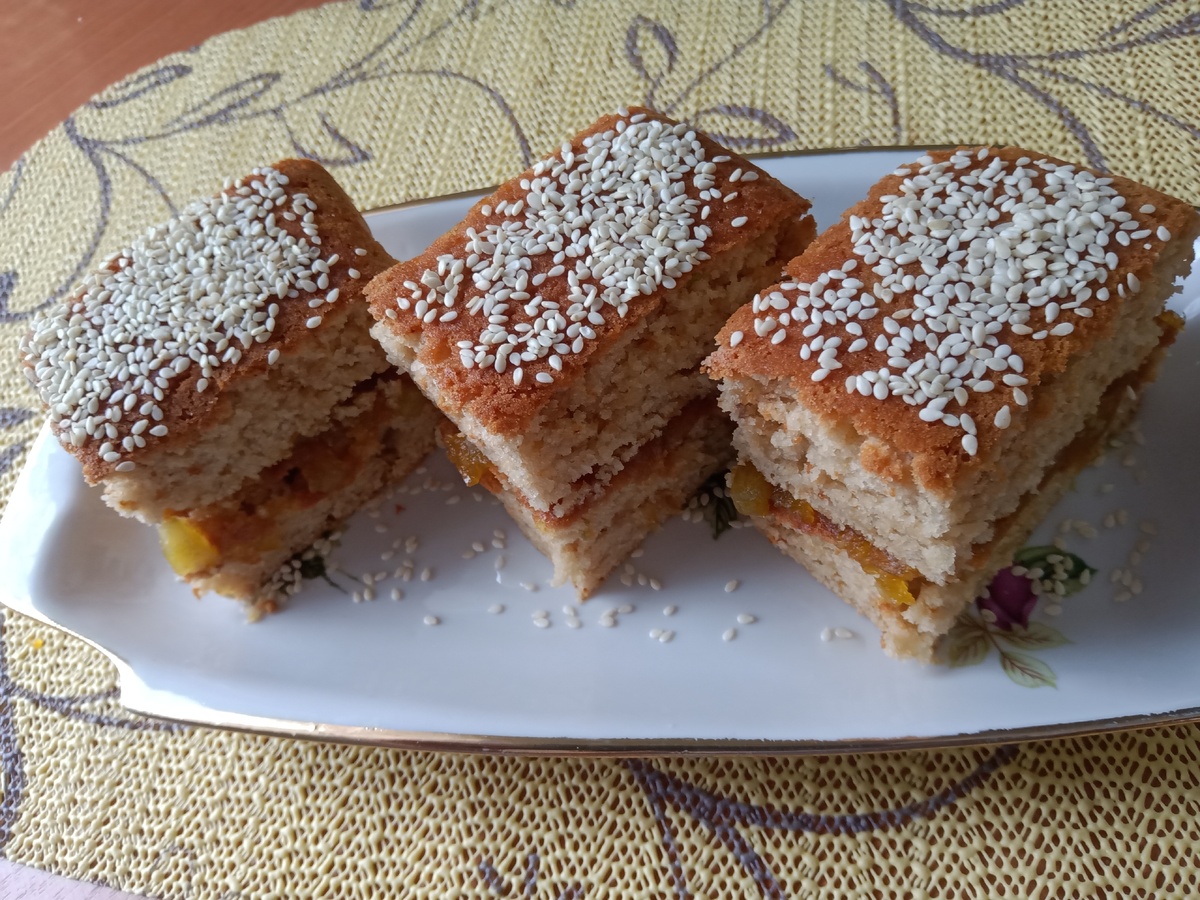 После готовности дайте коржу слегка остыть в форме, затем аккуратно переложите его на противень и разрежьте на две половины. Одну половинку обильно намажьте джемом, соедините обе части и нарежьте на порциальные пирожные. По желанию, украсьте сверху кунжутом, сахарной пудрой или дополнительным джемом.