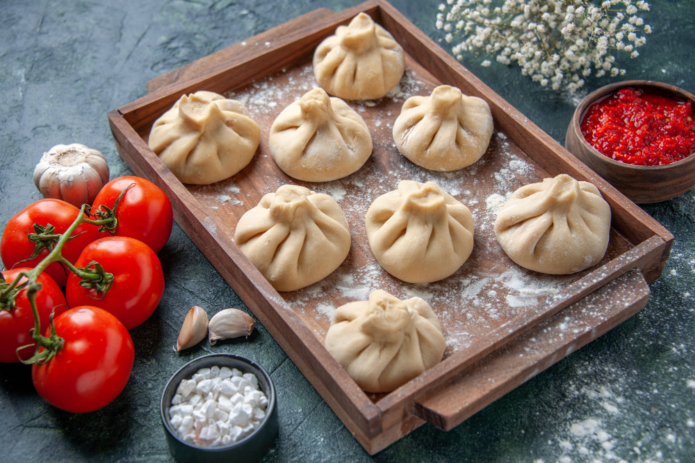 - Приготовление начинки: смесь из мяса, лука и специй, в которую постепенно добавляется ледяная вода для создания насыщенного бульона.