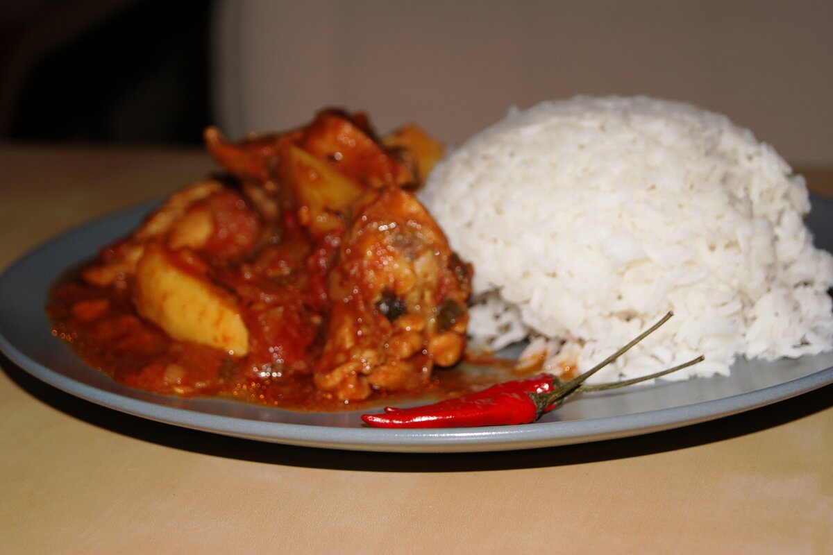 Снять кожу с курицы, порезать на крупные куски и замариновать на час с карри, куркумой и солью.Нагреть растительное масло в воке или сотейнике, добавить лавровый лист, кайенский перец и кориандр. Обжарить 30 секунд. Ввести крупно нарезанный чеснок, натертый имбирь и полукольца лука. Жарить 8 минут на среднем огне, помешивая.Добавить курицу, обжарить 5 минут, затем влить протертые томаты, посолить и перемешать. Далее добавить нарезанный картофель, влить воду, накрыть крышкой и тушить 20 минут. Затем добавить корицу, измельченный кардамон и рубленую кинзу, готовить еще 5 минут.Приготовить рис: промыть под холодной водой, добавить столько же холодной воды, чтобы уровень был на 2 см выше. Накрыть и довести до кипения, затем варить 15 минут на минимальном огне, не поднимая крышку. После выключить и оставить на 5 минут.