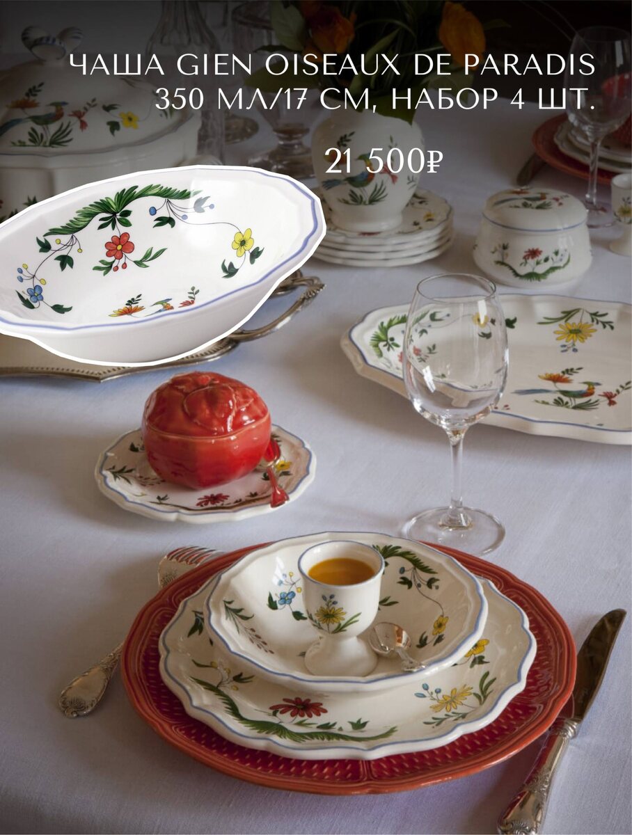 Настоящая жемчужина коллекции Oiseaux de Paradis от Gien — это чаша объемом 350 мл и диаметром 17 см, представленная в белом и разноцветном вариантах. С момента своего создания в 1865 году, этот фаянс стал символом французского кулинарного искусства. Тонкие мотивы, вдохновлённые райскими птицами и цветами, делают каждую вещь изящным произведением искусства.