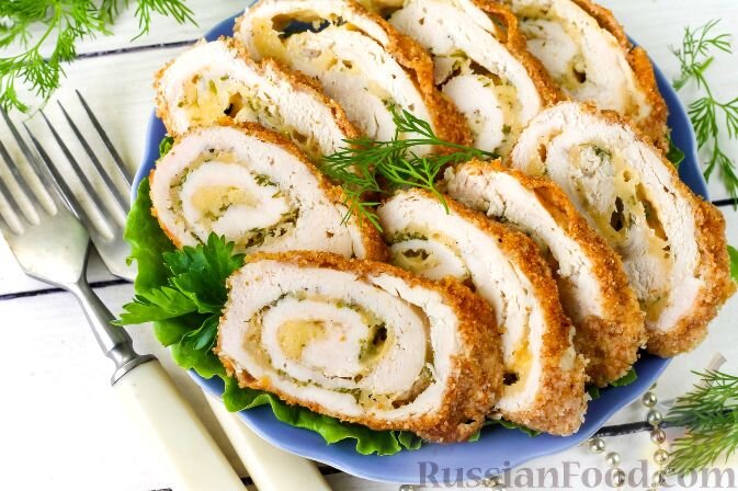 - Куриный рулет с сыром и зеленью: Нежное куриное филе, обернутое в аппетитную начинку из сыра и зелени. Идеальный вариант как для закуски, так и для основного блюда.